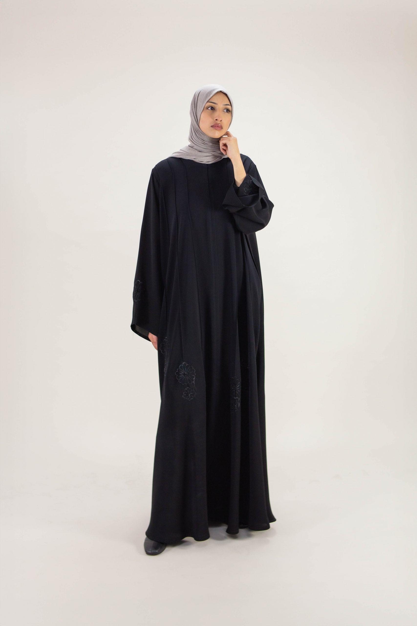 Luxury abaya brought to you by Arabian Garments. This premium quality Eternal Noir black abaya drapes effortlessly, creating a graceful silhouette. Delicate light embroidery weaves across the fabric, adding a touch of refined texture.
