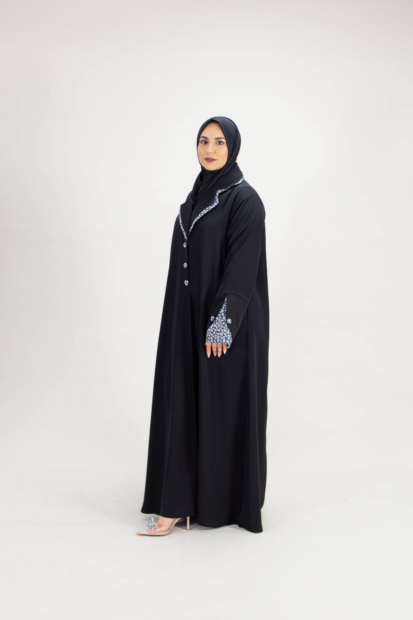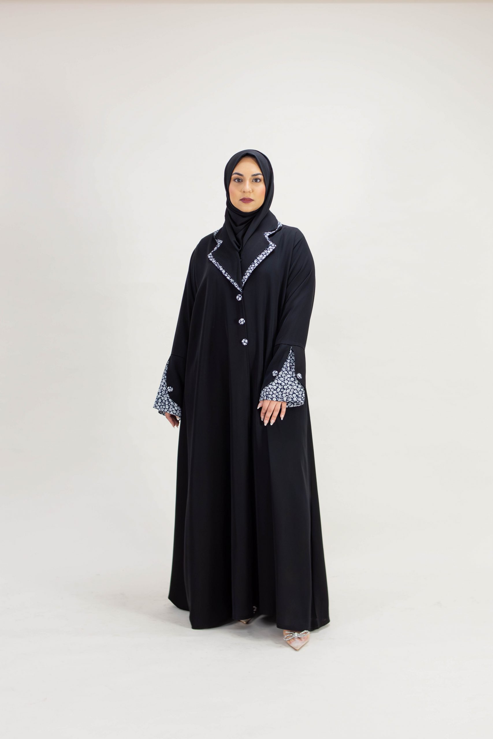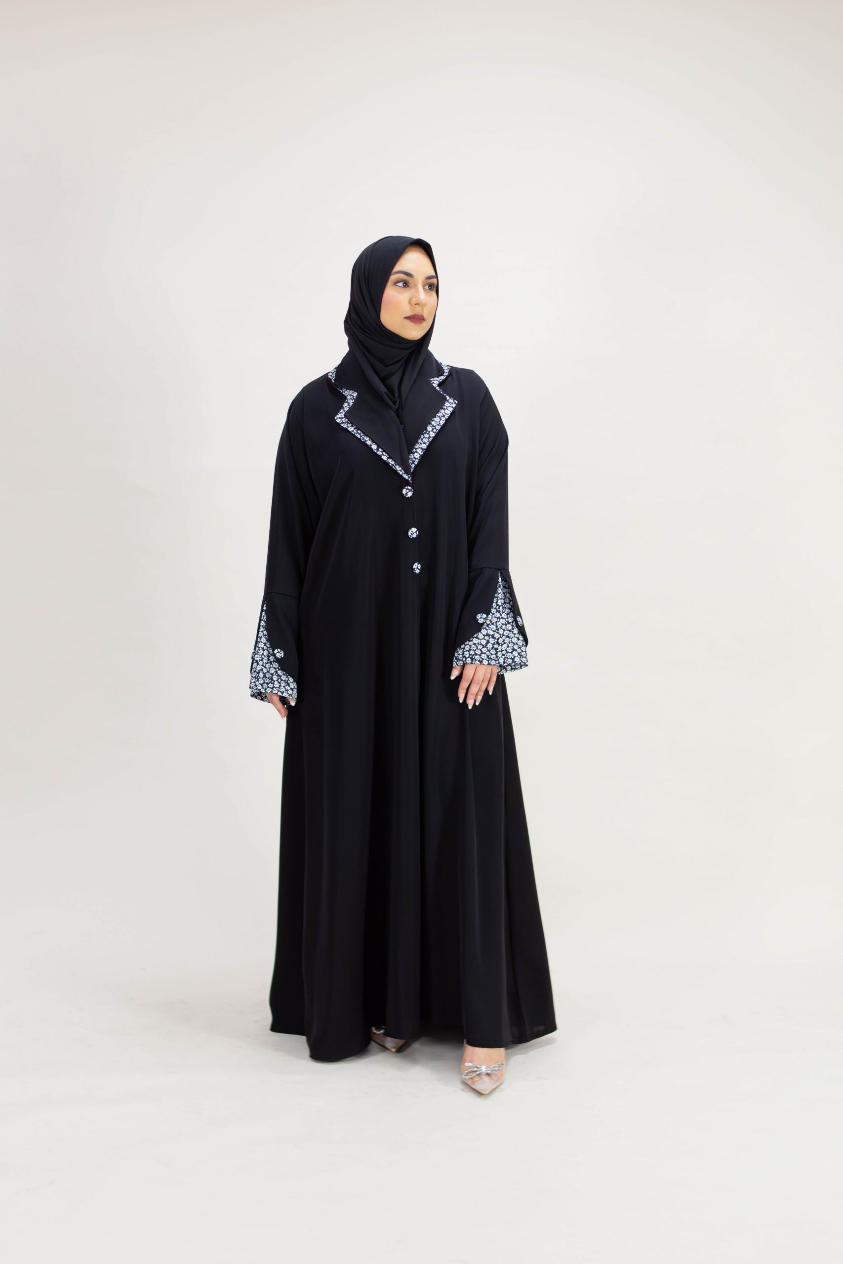 Black AbayaFloral Dusk – Black Collar Abaya with Floral Detailing