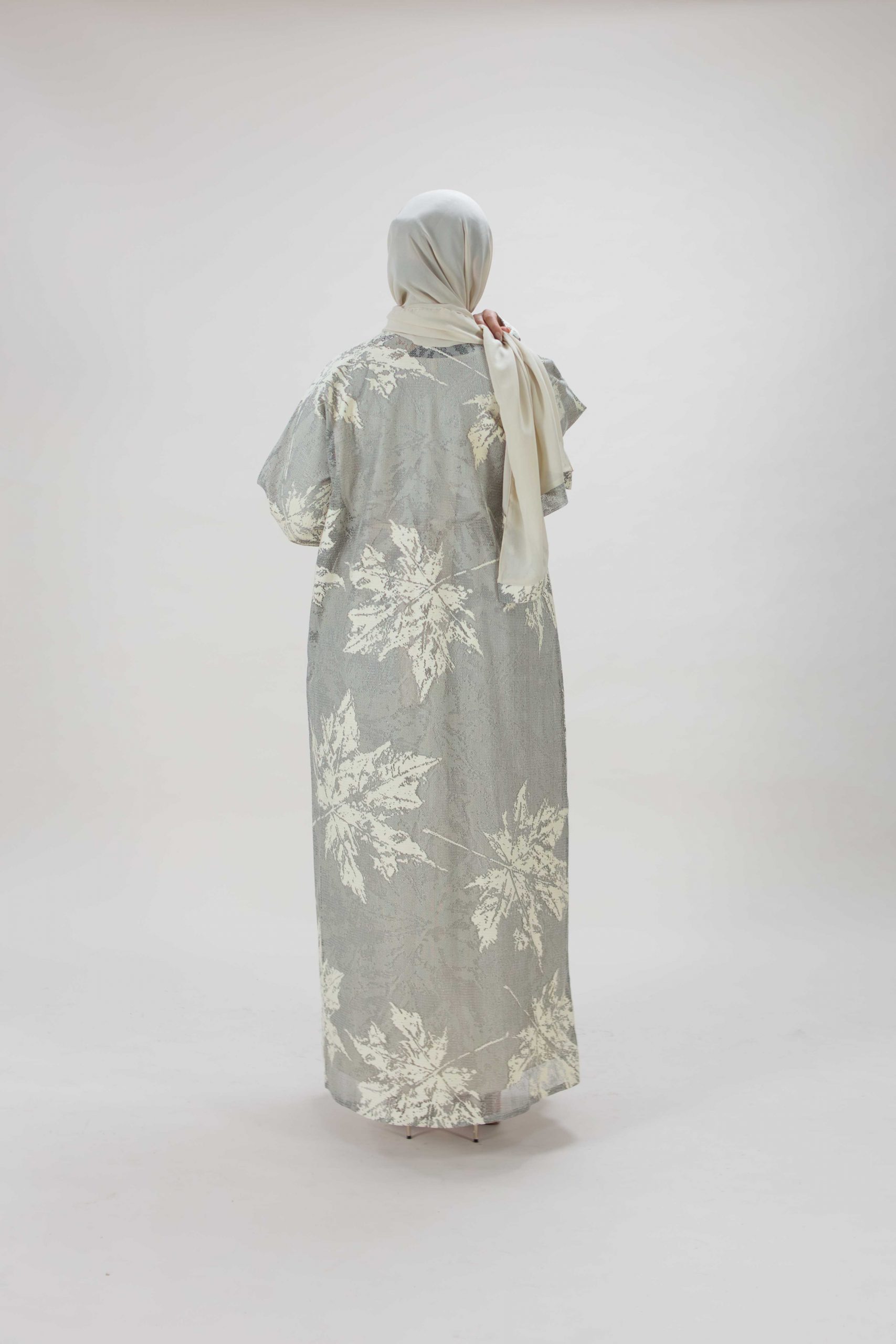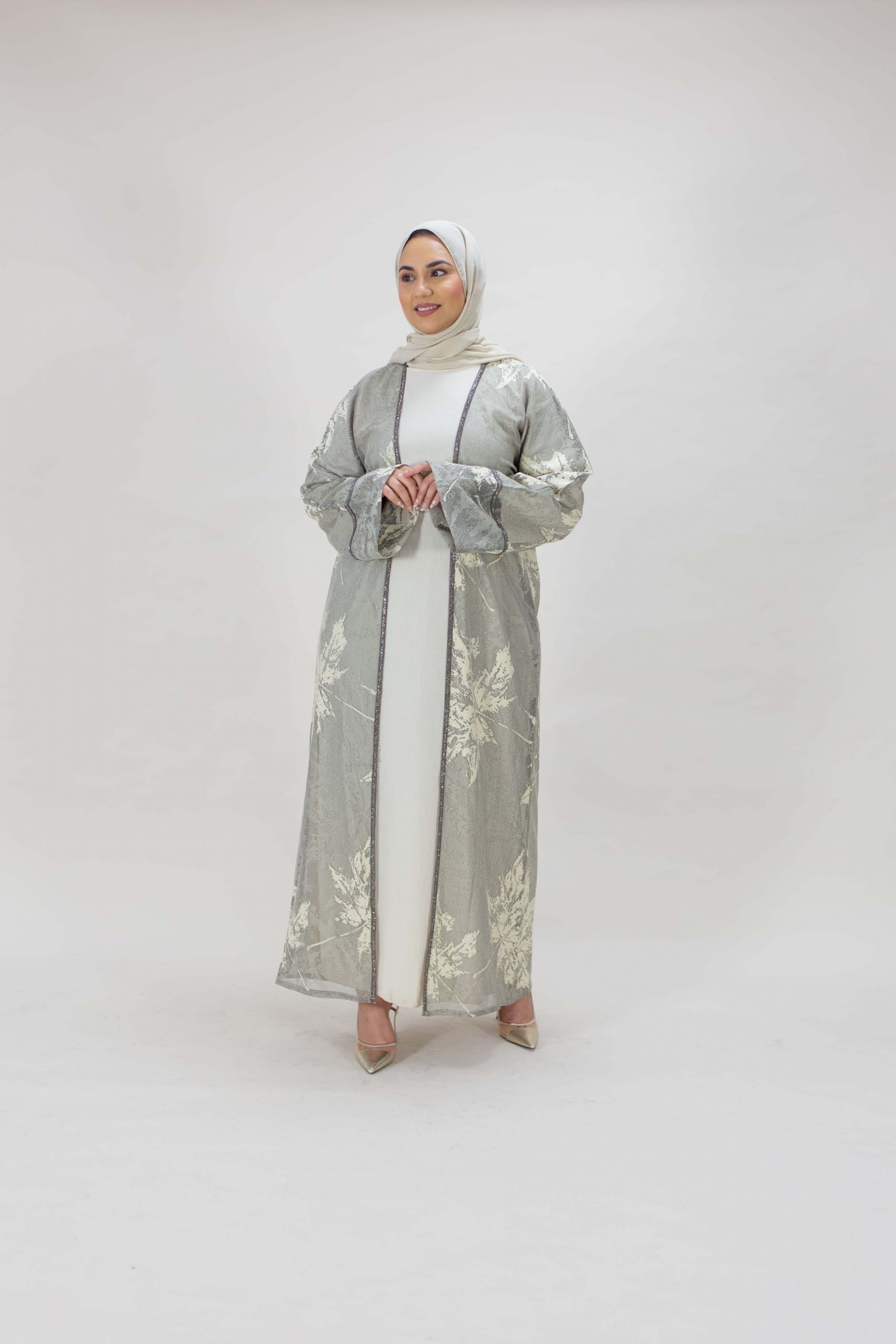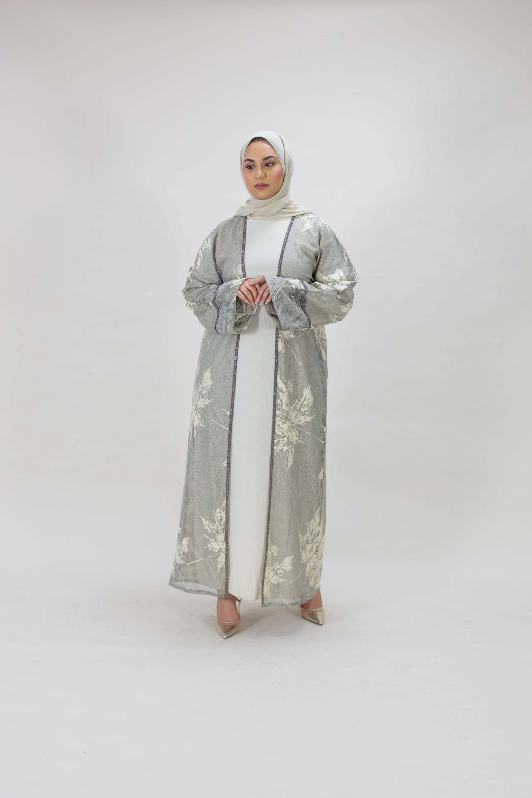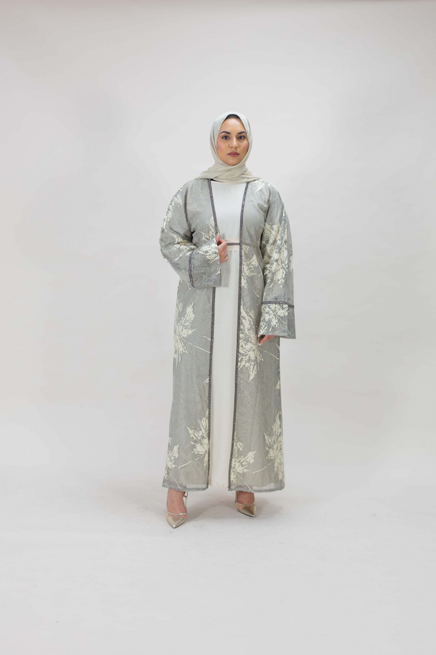 Luxury abaya brought to you by Arabian Garments. This sheer grey abaya features a delicate overlay of cream toned leaf patterns with a soft shimmer effect. It’s perfect for occasion wear, blending modesty with grace.