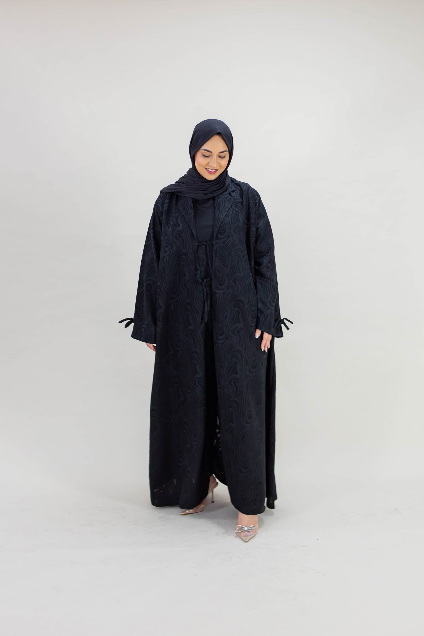 Luxury abaya brought to you by Arabian Garments. This Black edition of our Luxe Allure abaya brings a luxurious blend of silk and intricate jacquard detailing, whilst the bows on the sleeves provide a soft, refined touch. Find our Blue edition in our store selection if you prefer a refreshing blue version of this abaya!