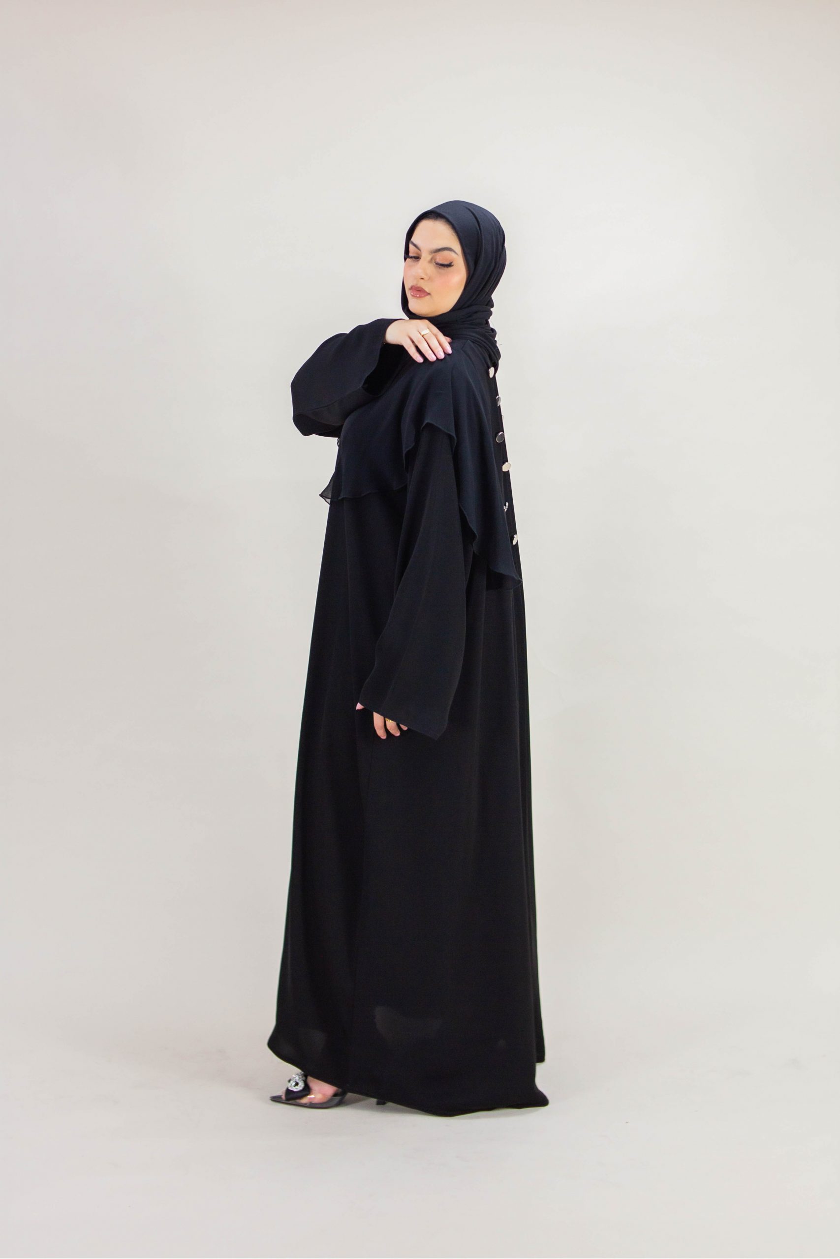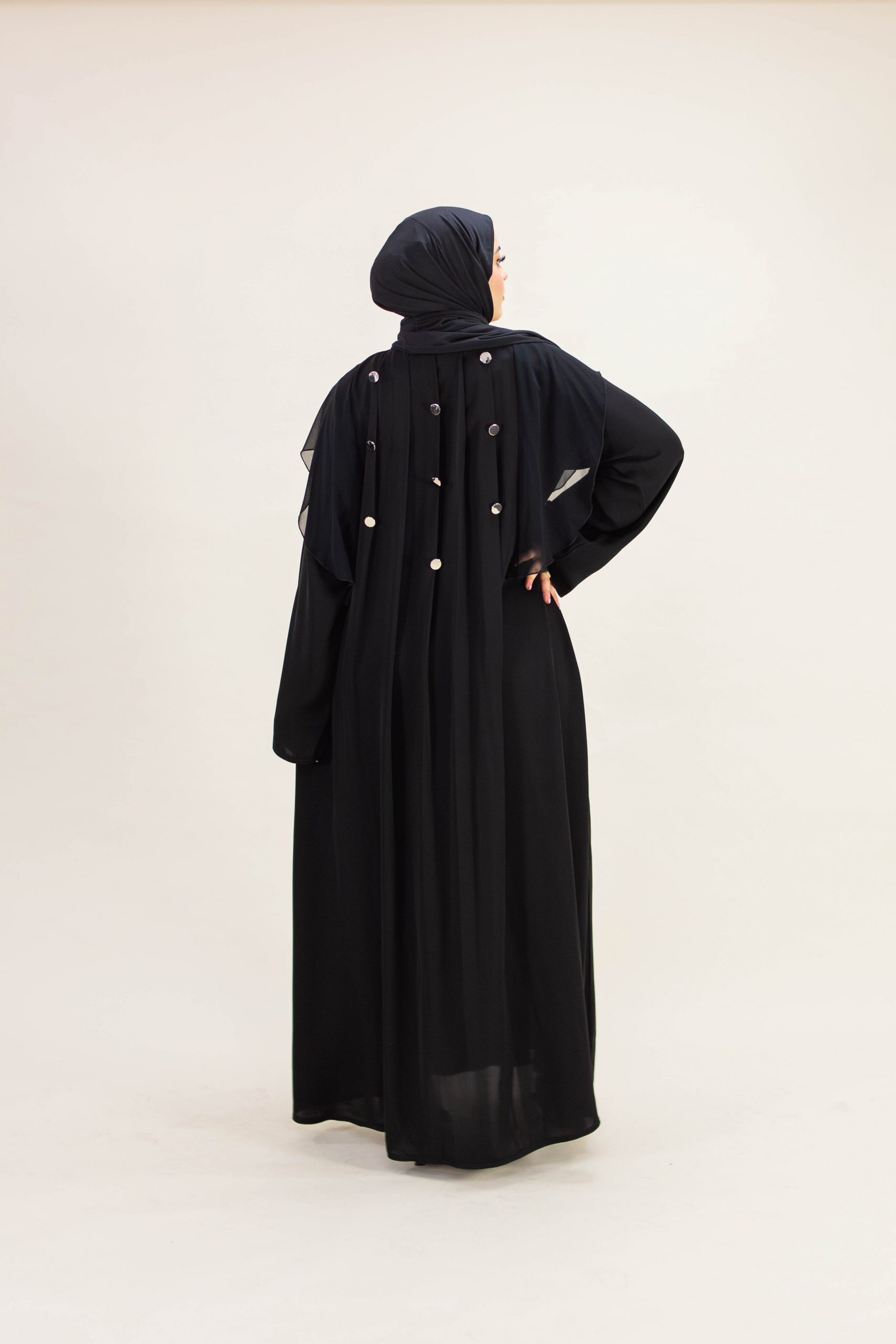 Luxury abaya brought to you by Arabian Garments. This premium quality Noir Mystique abaya features a flowing silhouette and back detailing which creates an effortlessly graceful look.