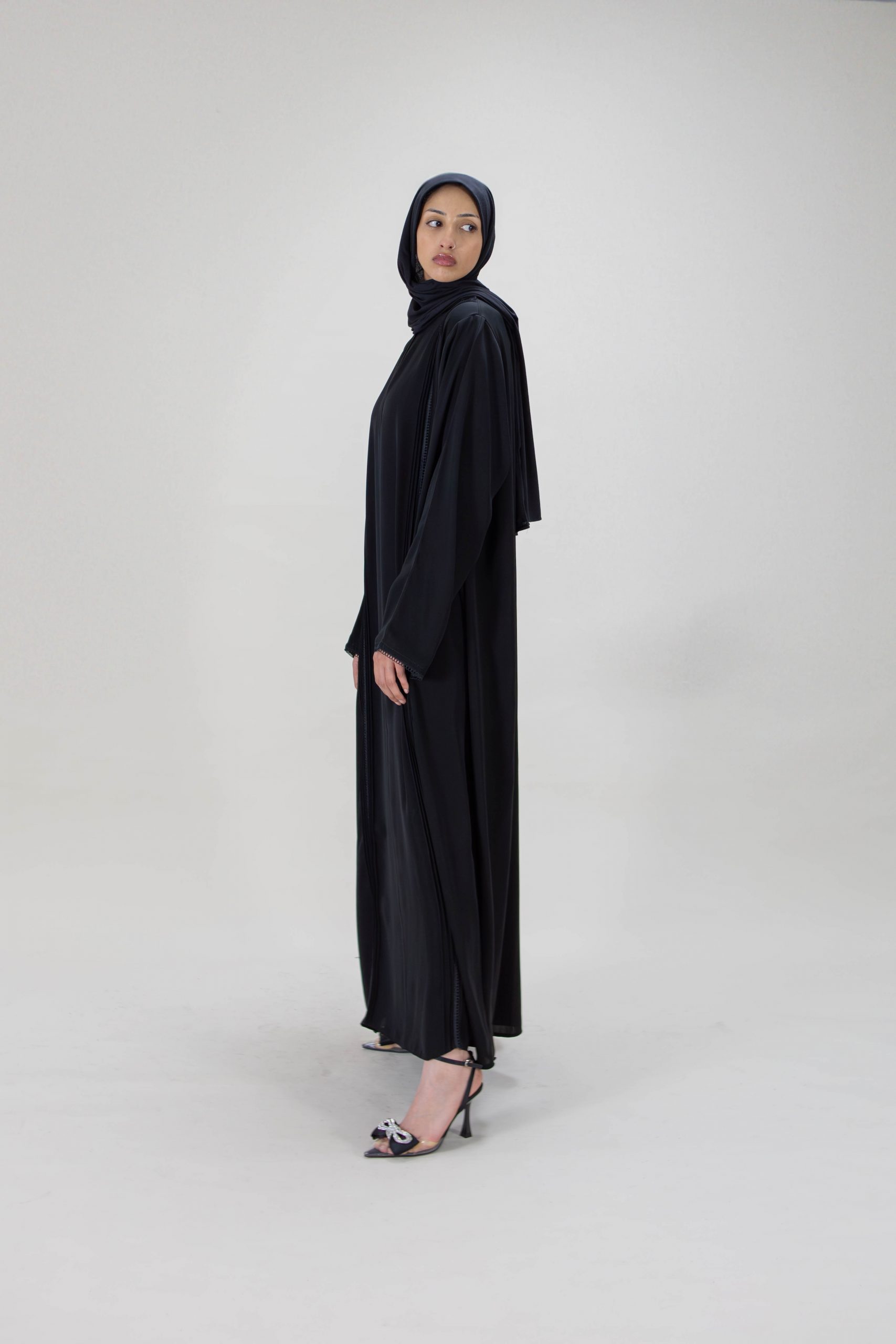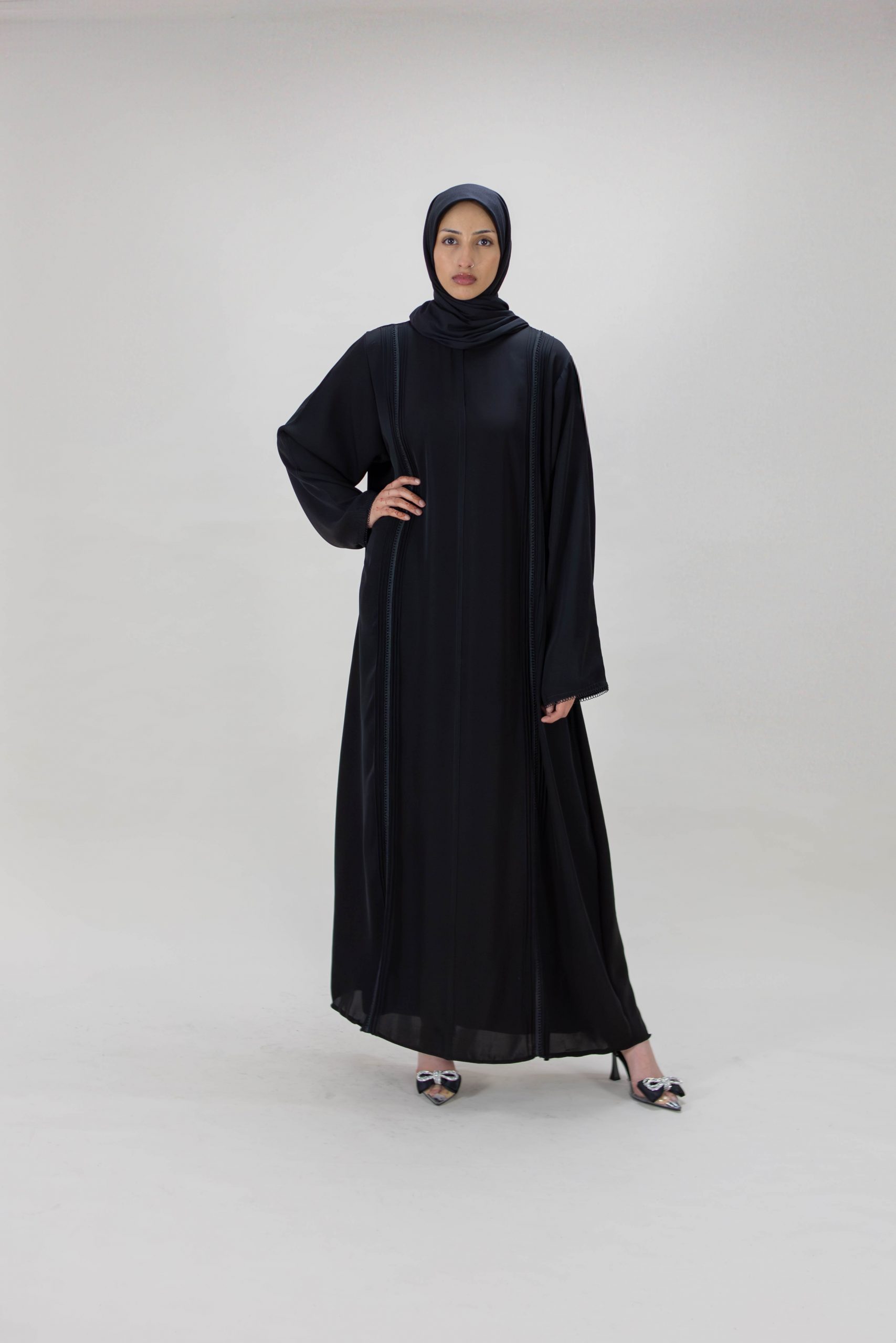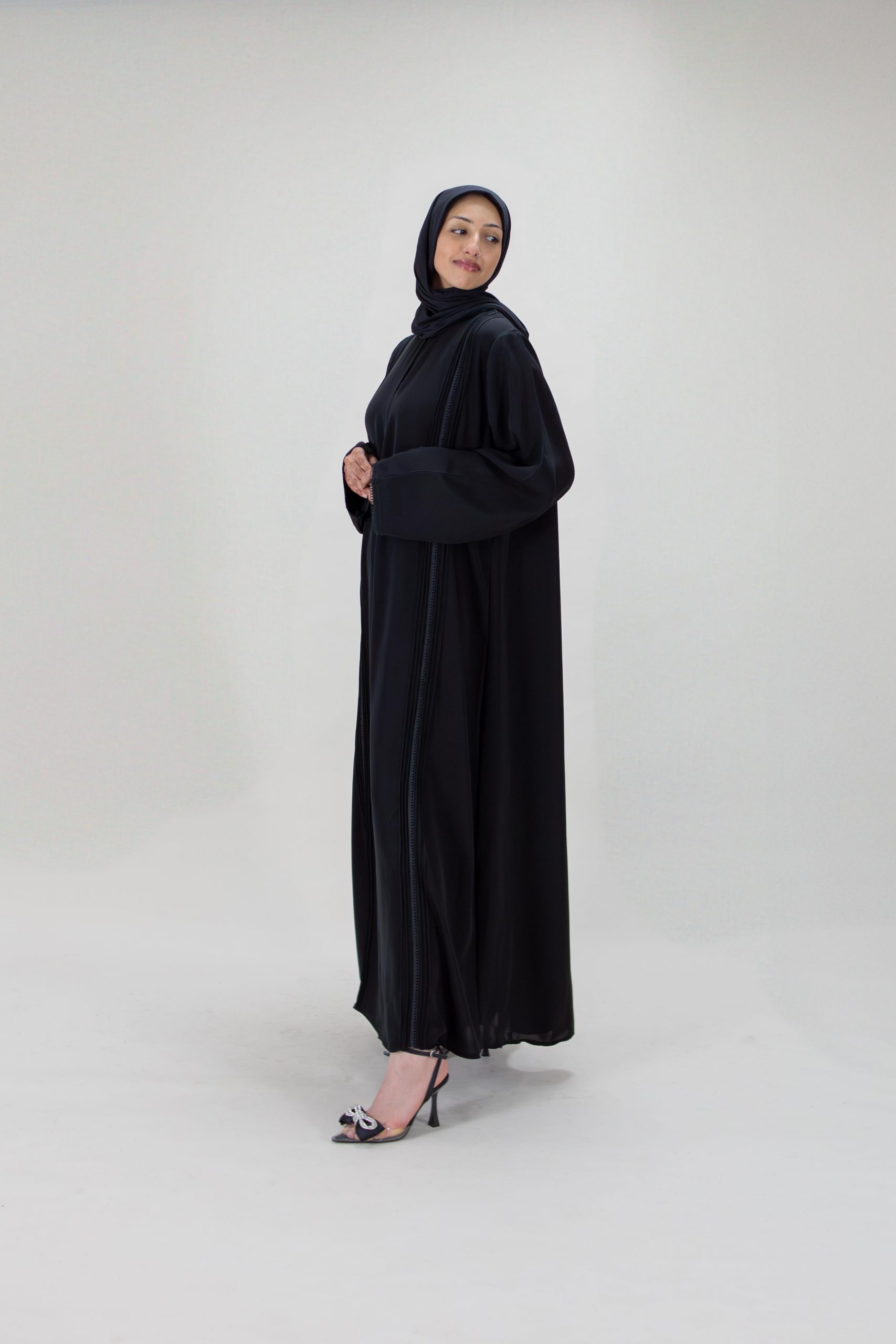 Luxury abaya brought to you by Arabian Garments. This timeless and sleek abaya is adorned with a minimal stitch detailing, adding a subtle texture. An elegant staple for any wardrobe.